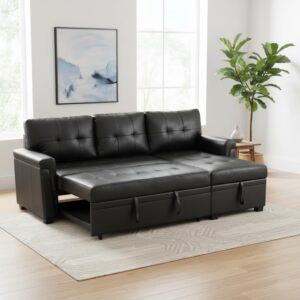 Multifunctional Sectional Sofa with Pull-Out Sleeper Bed & Hidden Storage – Reversible Chaise Black, Air Leather – Space-Saving, Durable, Stylish & Easy DIY Assembly for Apartments & Small Homes